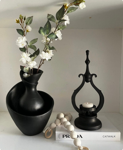 گلدان دکوری رومیزی همراه جاشمعی تک و گلدان دفرمه رنگ مشکی کد ۱۵۲۳