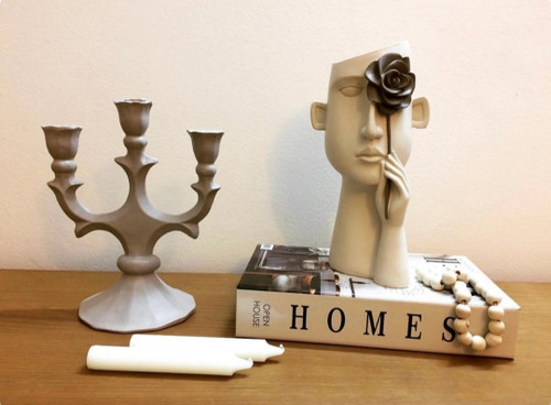 مجسمه رومیزی کاپل همراه گلدان مدل ساناز و شمعدان پیچ رنگ کرم استخوانی و طوسی تیره کد ۱۹۳۰