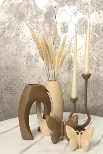 گلدان جفتی همراه شمعدان و پروانه های رومیزی رنگ کرم نسکافه ای کد ۱۷۴۹