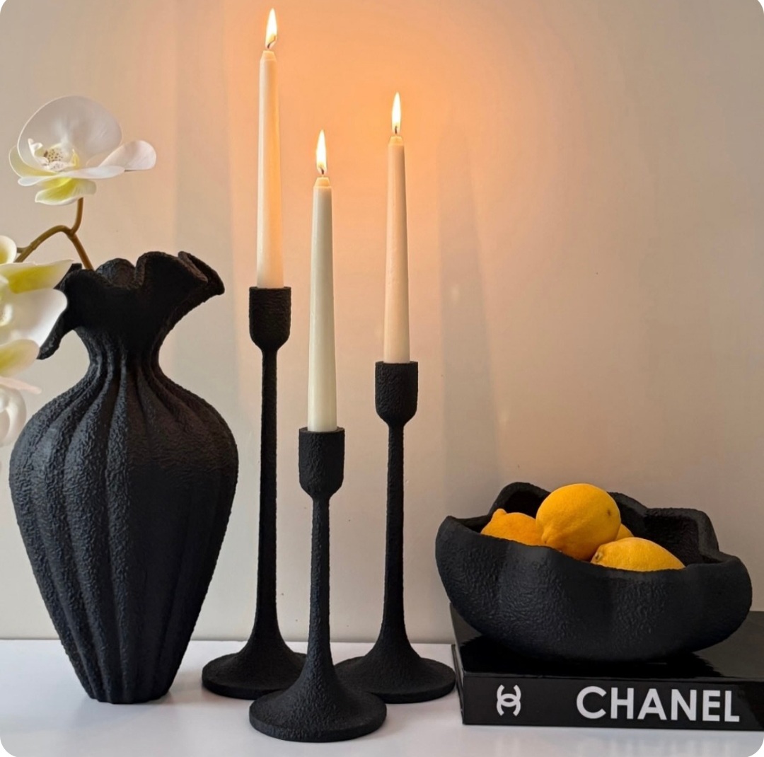 گلدان دکوری رومیزی همراه جاشمعی تک و گلدان دفرمه رنگ مشکی کد ۱۵۲۳