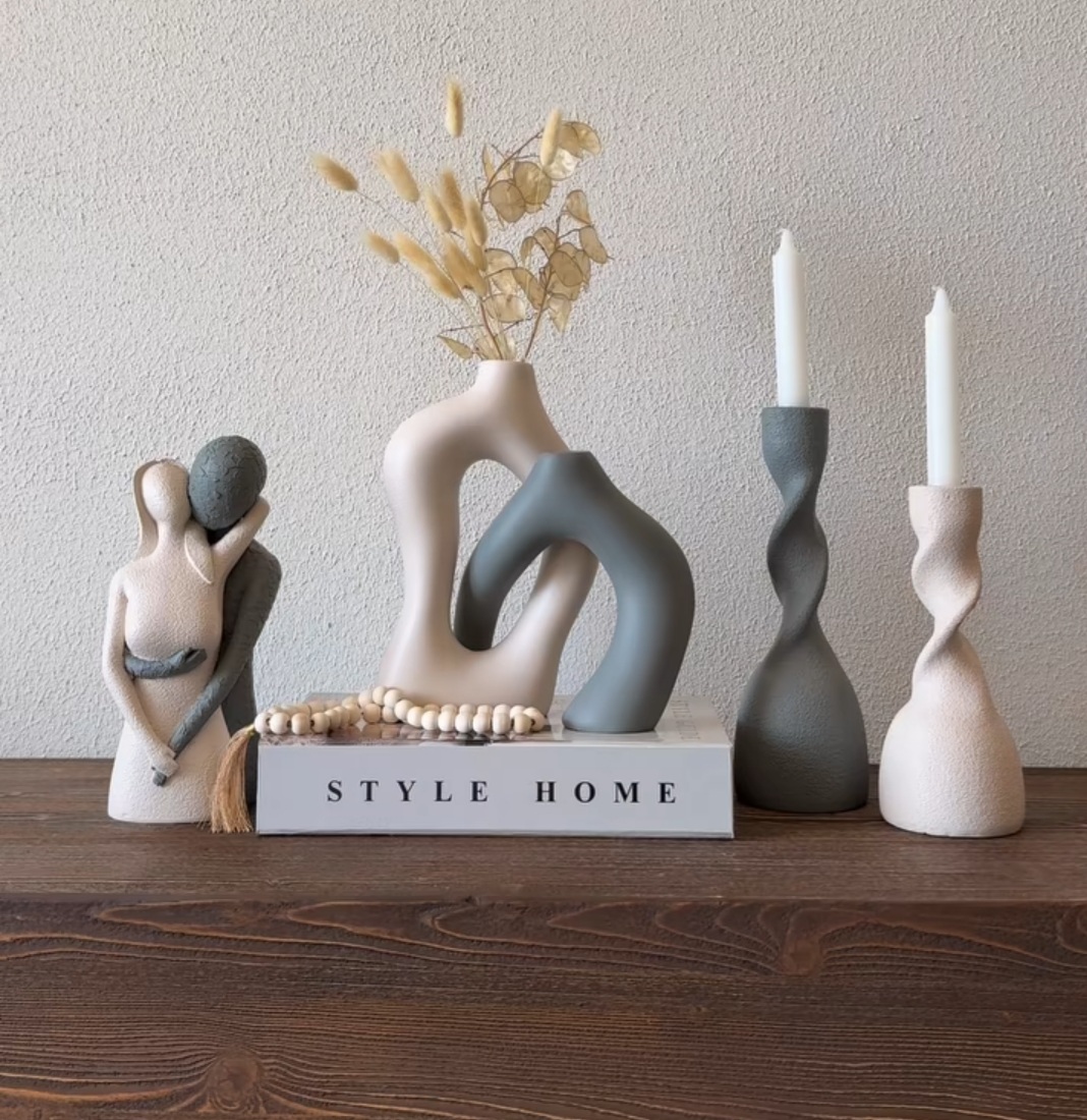 مجسمه رومیزی کاپل همراه گلدان مدل ساناز و شمعدان پیچ رنگ کرم استخوانی و طوسی تیره کد ۱۹۳۰