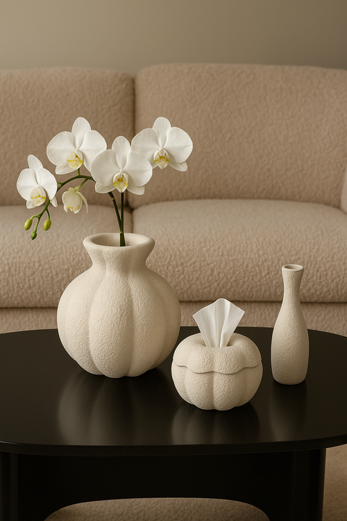 ست رومیزی گلدان جا دستمالی و شمعدان مینیمال رنگ کرم کد ۲۱۵۱