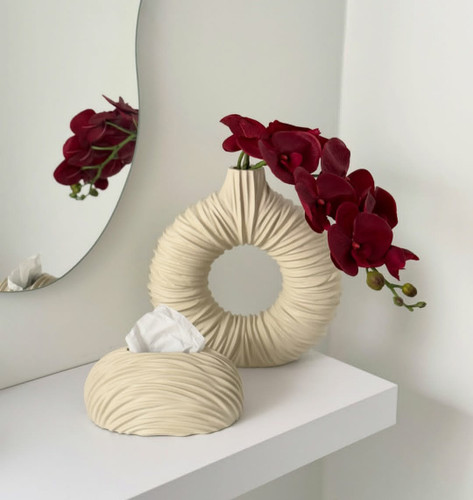 گلدان رومیزی شیاردار همراه جا دستمالی مدل دونات رنگ کرم کد ۲۱۰۹