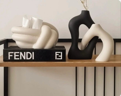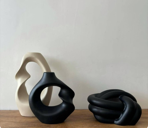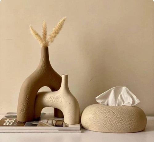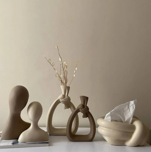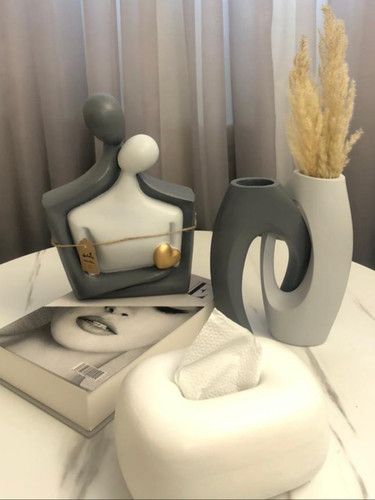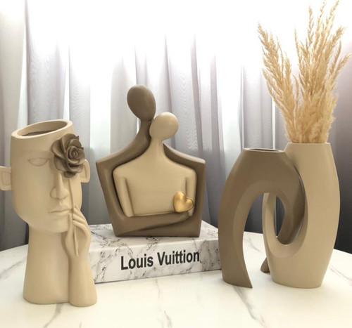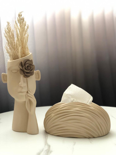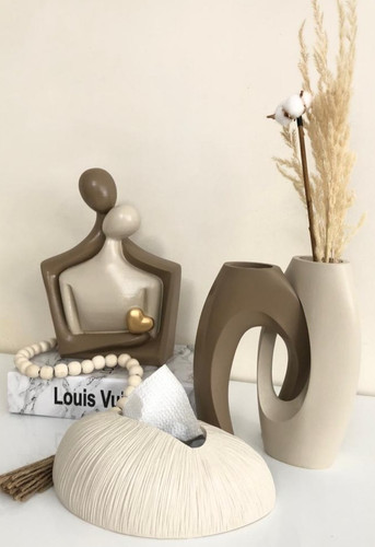 ست دکوری مجسمه زوج همراه گلدان دفرمه ساناز و جا دستمالی مدل دونات رنگ کرم نسکافه ای کد ۱۹۳۲