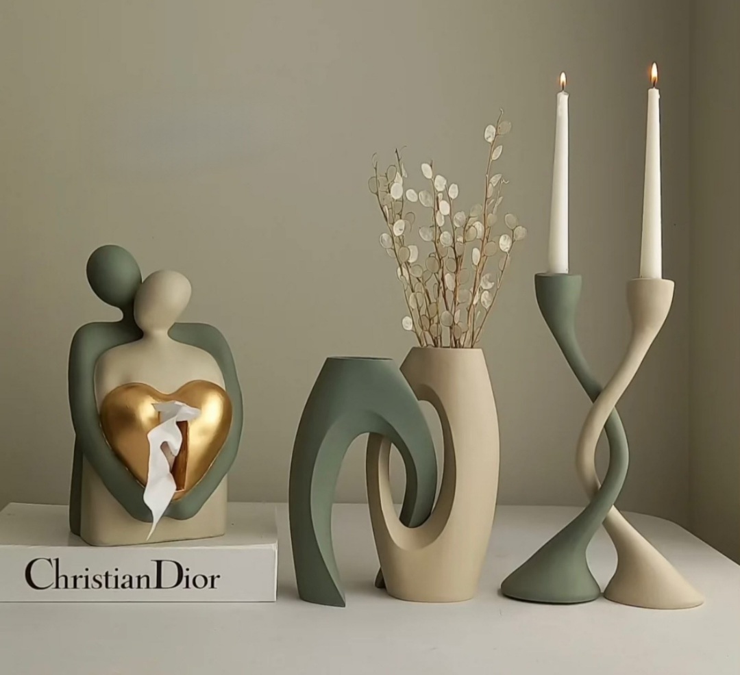 ست گلدان دکوراتیو جفتی همراه مجسمه آغوش و جا دستمالی مدرن رنگ کرم نسکافه ای کد ۱۷۴۲