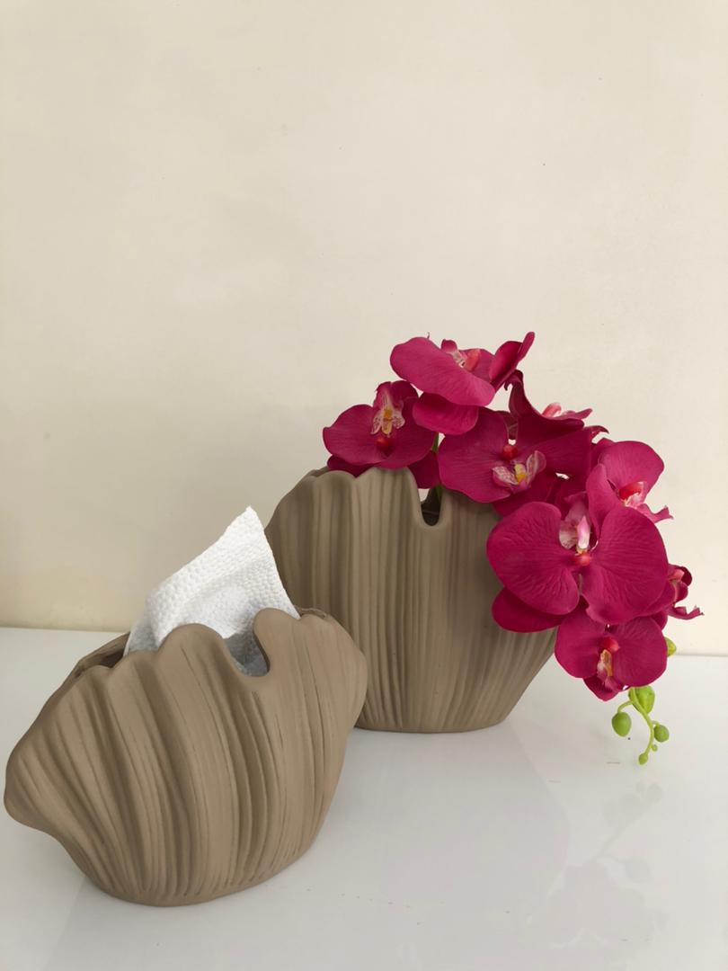 گلدان صدف همراه جا دستمال صدفی رنگ نسکافه ای کد ۱۷۲۸