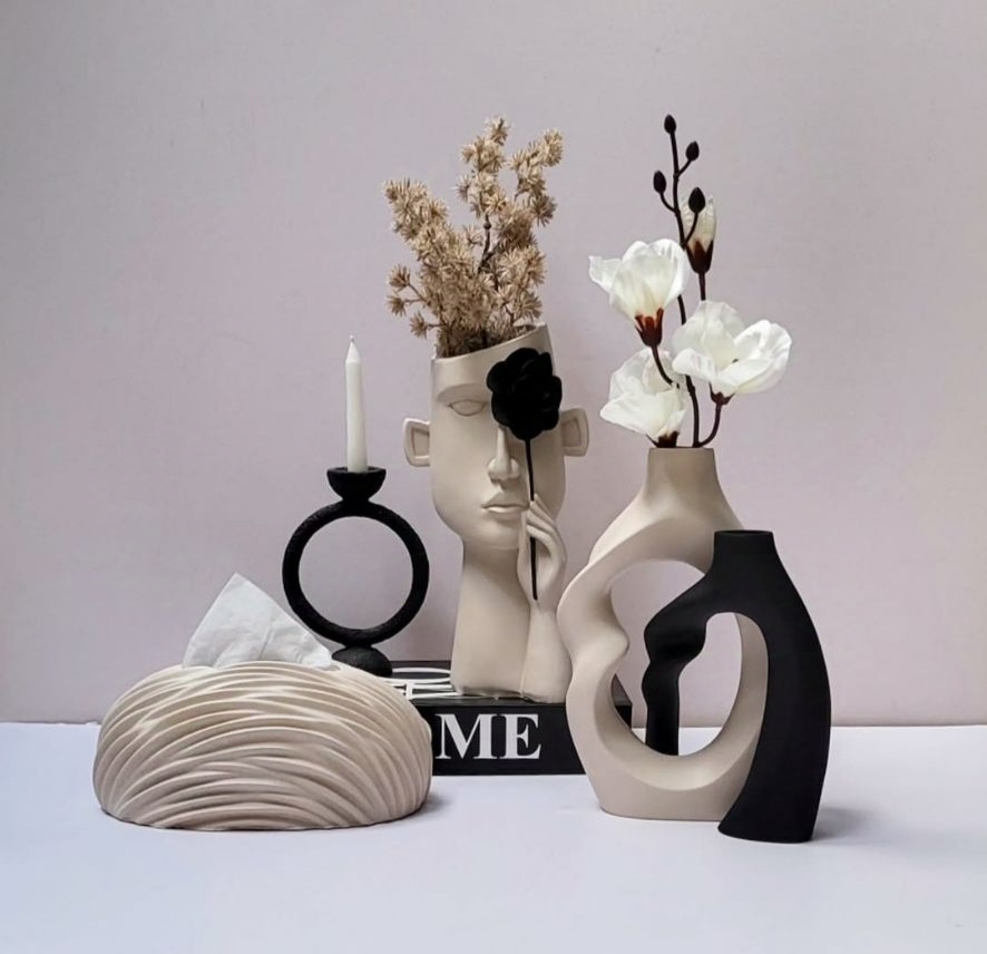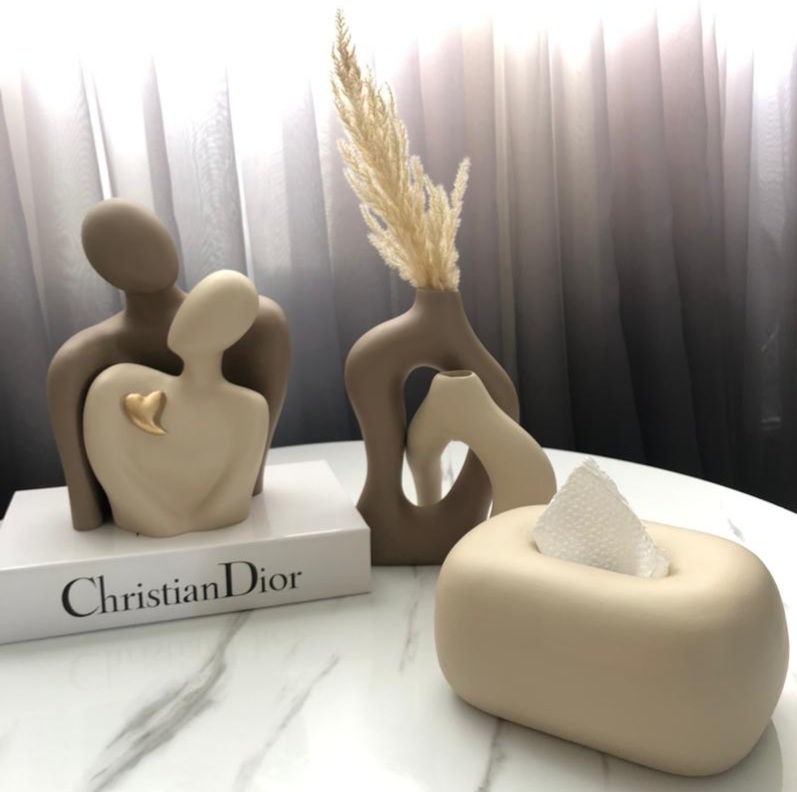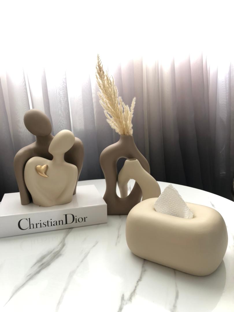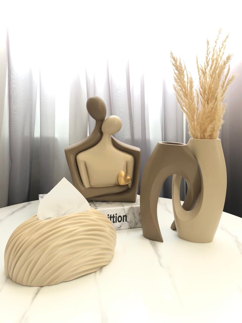 ست دکوری مجسمه زوج همراه گلدان دفرمه ساناز و جا دستمالی مدل دونات رنگ کرم نسکافه ای کد ۱۹۳۲