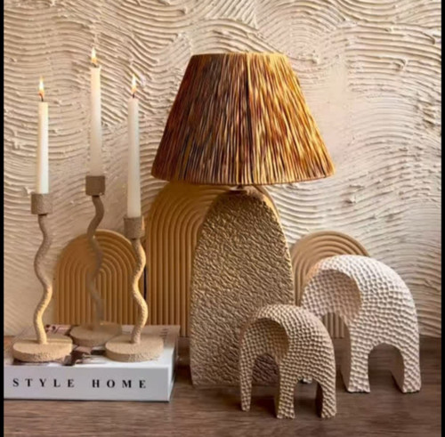 ست رومیزی مجسمه فیل دوتایی همراه آباژور بوهو و شمعدان رنگ کرم و نسکافه ای روشن کد ۰۰۱۸
