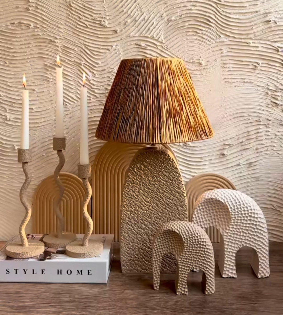 ست رومیزی مجسمه فیل دوتایی همراه آباژور بوهو و شمعدان رنگ کرم و نسکافه ای روشن کد ۰۰۱۸