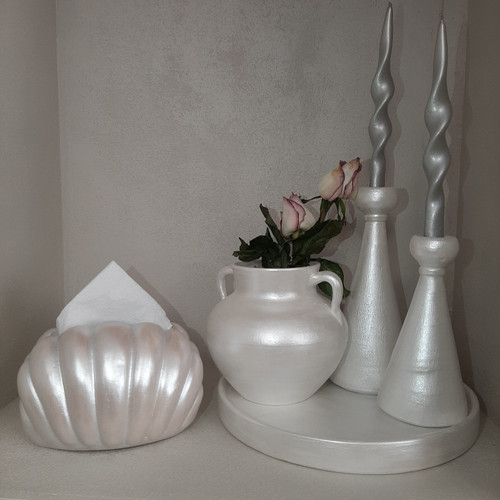 ست صدفی جلو مبلی ۵ تیکه سینی، گلدان سفالی ، شمعدان همراه جا دستمالی کد ۱۲۵۶