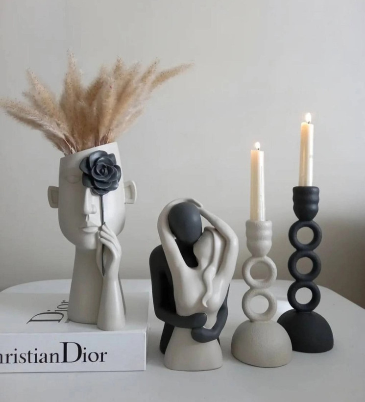 چونکه هم یه گلدون جذاب دارید که حتی میتونید گل طبیعی داخلش بکارید ...هم دو جفت جا شمعی مینیمال مدرن دارید و قشنگترین آیتم هم مجسمه آغوش هستش که محشره 😍