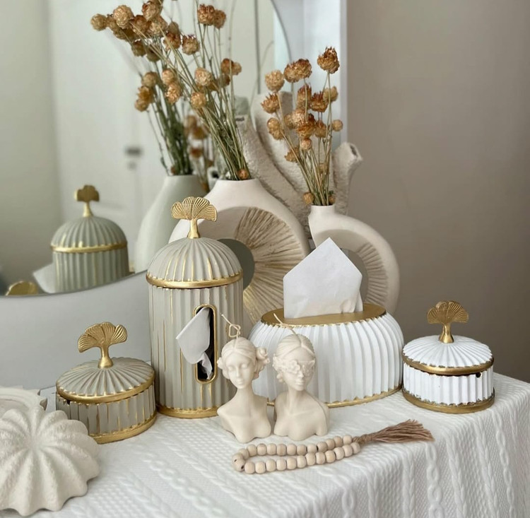 ست شدیدا لوکس و شکیل جا دستمالی مدل شیار دار به رنگ سفید طلایی همراه قندان و یا زیرسیگاری درب نیلوفری که ترکیبشون خیلی خیلی جذابههه و ب ای روی میز جلومبلی انتخاب فوق العاده ای میشه 👌