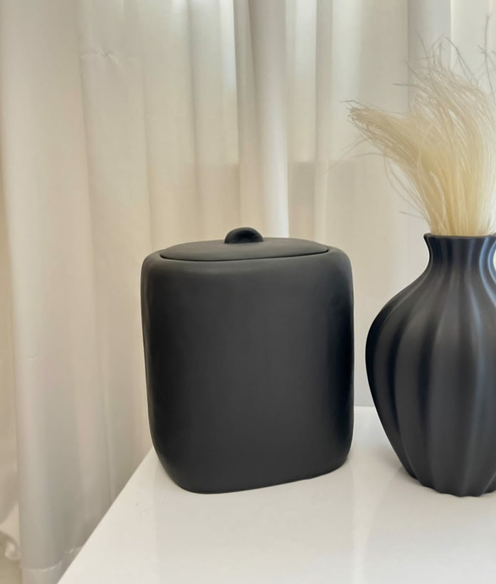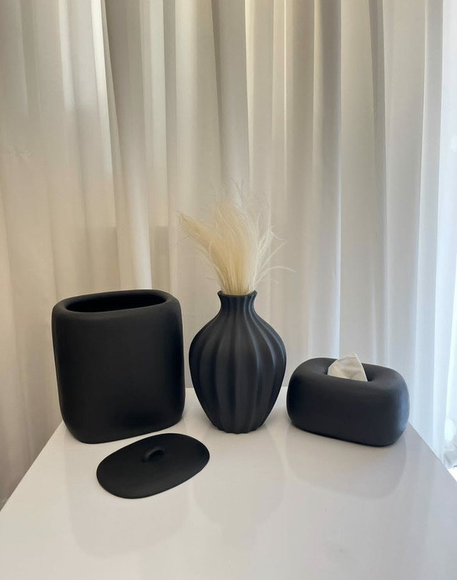 ست سطل درب دار همراه جا دستمالی یک کار مینیمال مناسب فضا و چیدمان های مدرن منزل و محل کار شماست همراه این ست یک گلدان رومیزی وجود دارد که برای روی میز جلومبلی و کنسول شما بهترین انتخاب است .
