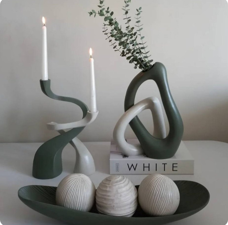 ست گلدان دکوراتیو رومیزی دفرمه همراه شمعدان مدل پیچک و سینی دکوراتیو بیضی و گوی ها کد ۲۲۳۷