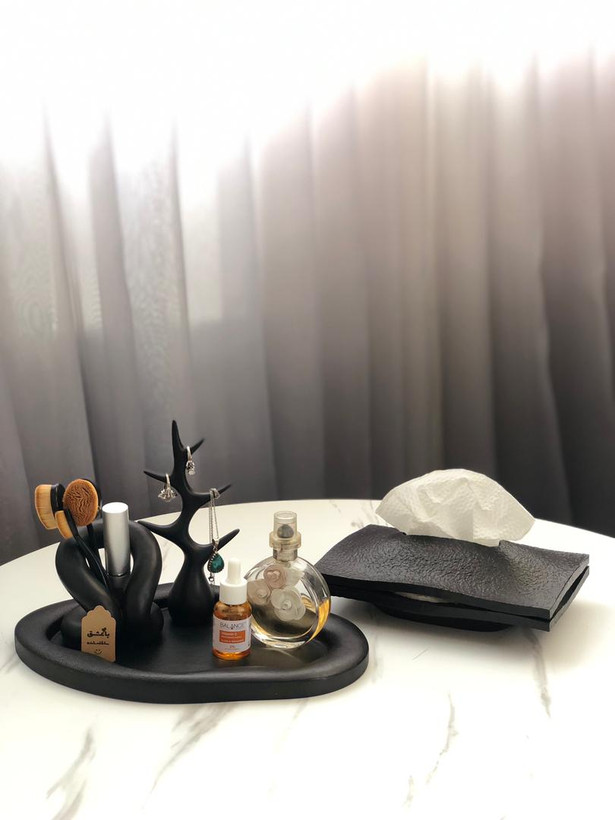 ست دکوراسیون میز آرایشی جا دستمالی دو تیکه همراه استند شاخه آویز جواهرات و جابراشی و سینی دفرمه اکسسوری کد ۰۲۲۴